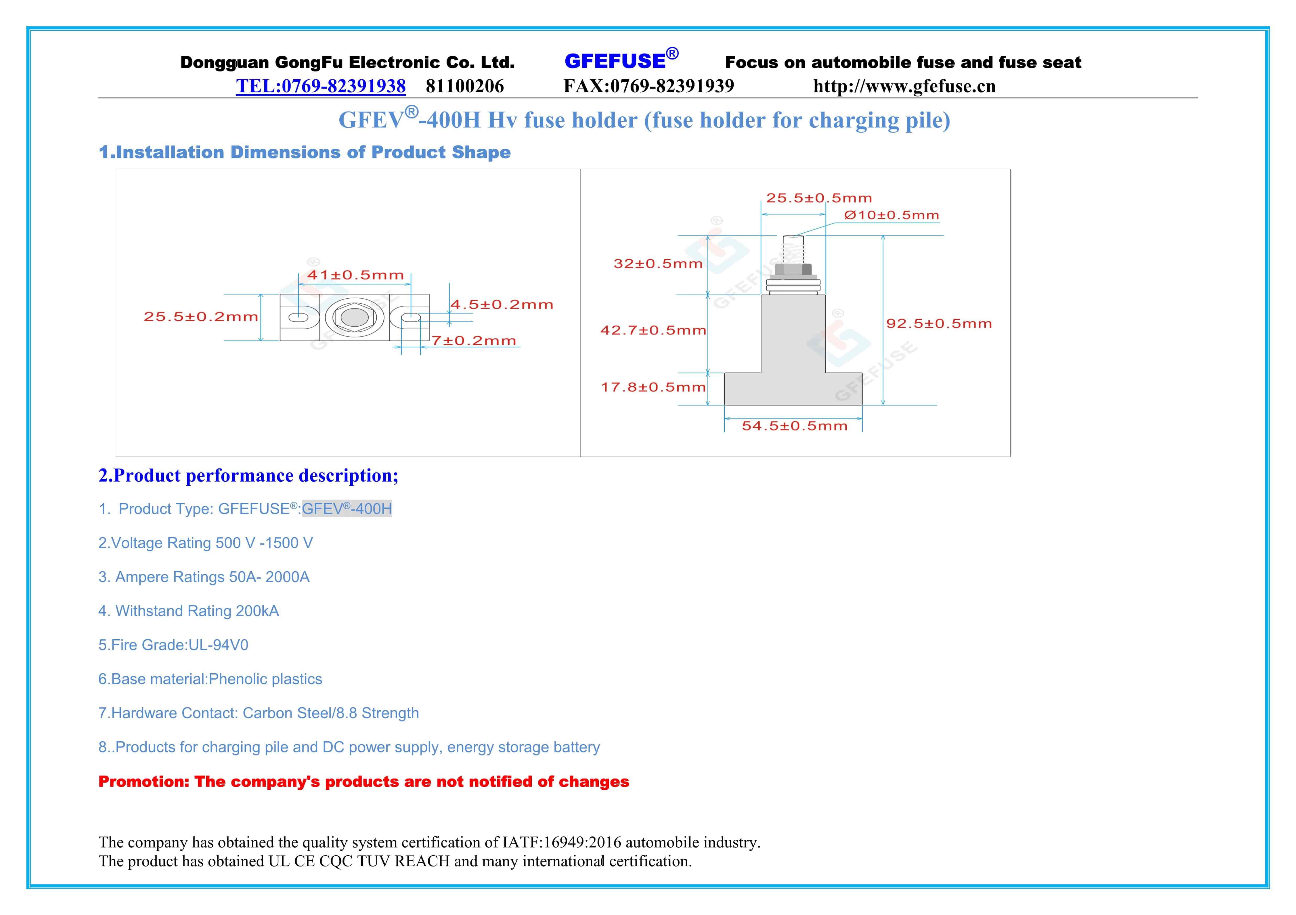 東莞市貢福電子有限公司專業(yè)制造銷售太陽能光伏熔斷器、新能源車用保險(xiǎn)絲、微型保險(xiǎn)絲、叉栓保險(xiǎn)絲、汽車保險(xiǎn)絲、高壓保險(xiǎn)絲、貼片保險(xiǎn)絲、陶瓷保險(xiǎn)絲、汽車保險(xiǎn)絲座、汽車熔斷器、突跳式溫控器、汽車過載保護(hù)器,保險(xiǎn)絲座,汽車插片保險(xiǎn)絲。插片保險(xiǎn)絲座,叉栓保險(xiǎn)絲座,叉栓保險(xiǎn)絲盒,螺栓保險(xiǎn)絲,螺栓保險(xiǎn)絲座,低壓熔斷器.直流熔斷器,直流保險(xiǎn)絲,車用保險(xiǎn)絲,車用保險(xiǎn)絲座等。產(chǎn)品通過UL CE CQC TUV REACH等認(rèn)證??蛻舯椴紡V東、江蘇、東莞、上海等全國各地。